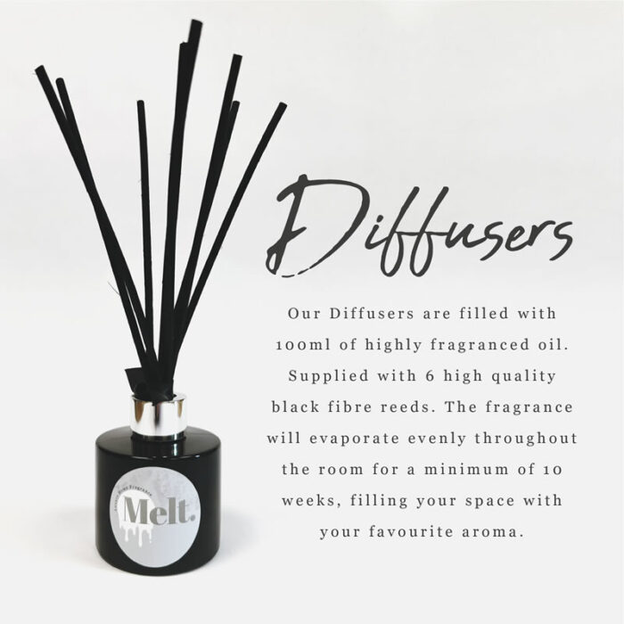 Our Diffusers are filled with 100ml of highly fragranced oil. Supplied with 6 high quality black fibre reeds. The fragrance will evaporate evenly throughout the room for a minimum of 10 weeks, filling your space with your favourite aroma.
